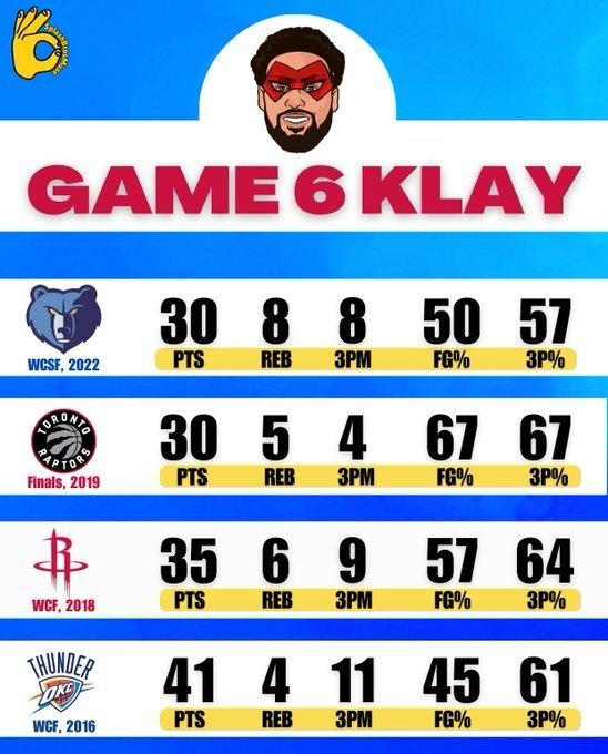 在这8场比赛里,汤普森不乏经典表现:2016年西决G6,汤普森41分4篮板11三分,投篮命中率45%,三分命中率61%;2018年西决G6,汤普森35分6篮板9三分,投篮命中率57%,三分命中率64%;2019年总决赛G6,汤普森30分5篮板4三分,投篮命中率67%三分命中率67%;2022年西部半决赛G6,汤普森30分8篮板8三分,投篮命中率50%,三分命中率57%。