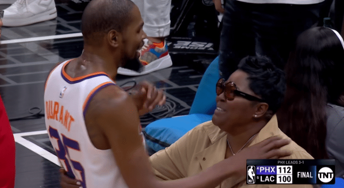 太阳拿下G4后,杜兰特和他的妈妈开怀大笑,满脸笑容太开心。