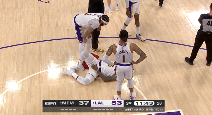 来源:24直播网04-23 12:0124直播网讯04月23日,NBA季后赛湖人G3主场对阵灰熊,下半场第三节,詹姆斯惨遭狄龙袭裆,痛苦倒地,裁判回放之后,升级判罚狄龙吃到二级恶犯被驱逐离场。