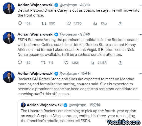 Woj跟进报道称,火箭队拒绝执行塞拉斯第四年的合同选项,结束了塞拉斯在火箭队的3年任期;火箭需要一位大牌主教练担任主帅,他们的新帅目标人物有猛龙主帅纳斯、湖人旧帅沃格尔、前凯尔特人主帅乌度卡和勇士助教阿特金森。