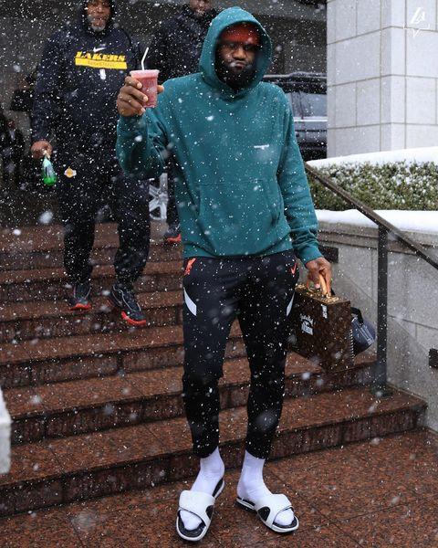 湖人众将冒着风雪前往爵士主场,詹姆斯、里夫斯等人都穿着卫衣,没有穿羽绒服,其中38岁老詹穿着拖鞋以及撅嘴表情十分抢镜;浓眉则是套着羽绒服,包裹地比较严实。