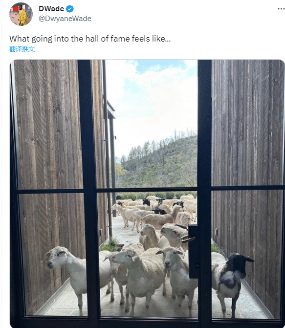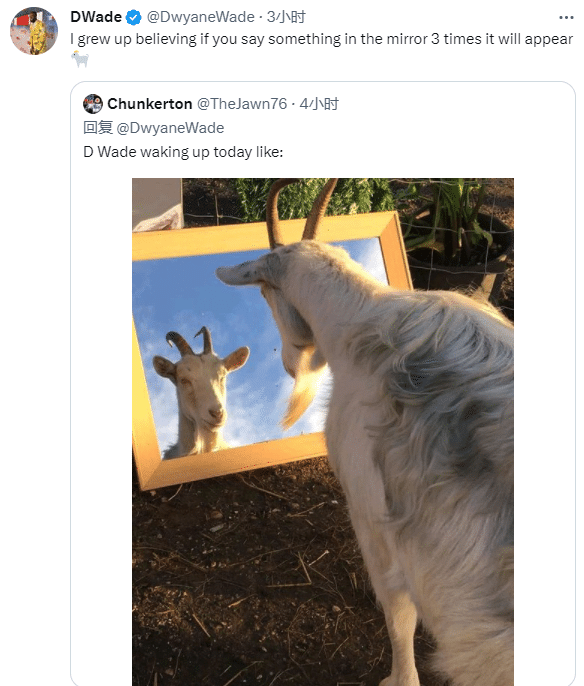 韦德连续发推,先是发推表达感谢,然后晒多个山羊(历史最佳)照并写道:进入名人堂的感觉就像这张图;韦德暗示入选者都是山羊;有球衣晒出一张山羊晒镜子的图片并打趣道:“韦德早上起来是这个样子的。韦德转发并写道:我从小就相信,如果你对着镜子说三遍某件事,它就会成真。