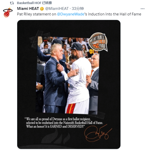 热火官方、公牛官方、爵士官方纷纷发推祝贺韦德,帕特-莱利声明为韦德入选名人堂感到骄傲;韦德生涯未效力过爵士,但目前他是爵士队小老板,爵士官推发声:3届总冠军当之无愧的荣誉。
