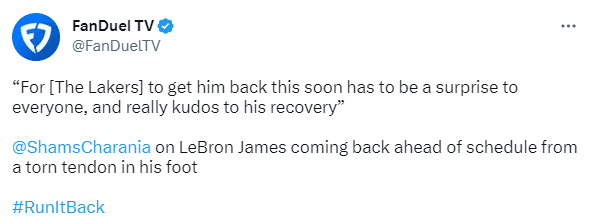 shams在节目中表示:我认为这是勒布朗-詹姆斯令人印象深刻的好转,他在上周才开始球场活动。勒布朗身边的人对他的期待都是在最后一周复出,也就是常规赛的最后3-4场比赛。他在还剩8场常规赛时复出了,我知道的是他这么早复出并不是预期之中的,他只缺席了四周,这令人惊叹,他们能够这么早迎回他,这肯定惊到了所有人,必须对他的努力康复致敬。