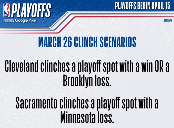 克利夫兰骑士赢球后,战绩48胜28负排在东部第4位,领先热火多达7.5个胜场;赢球后骑士正式锁定一个季后赛席位,时隔5年重返季后赛;目前联盟晋级季后赛的六支球队分别是东部雄鹿、凯尔特人、76人和骑士,西部掘金和灰熊。