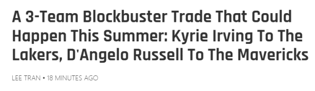湖人方面,拉塞尔因伤缺席了湖人对雷霆的比赛,由于赛季中期被交易以及即将进入自由球员市场,他在采访中表示自己尚未在洛杉矶找到家的感觉。湖人记者Buha此前承认,欧文是一个比拉塞尔好得多的球员。健康状态下的欧文,可以让湖人成为争冠热门,而且詹姆斯是他愿意再次联手的球员。另外,把比斯利和班巴换成罗齐尔或许会更奏效,罗齐尔的得分能力更强。