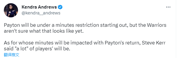 据名记Kendra Andrews报道,小佩顿明日复出后将受到出场时间限制,至于谁的上场时间会因佩顿二世的回归而受到影响,史蒂夫-科尔表示:很多球员。