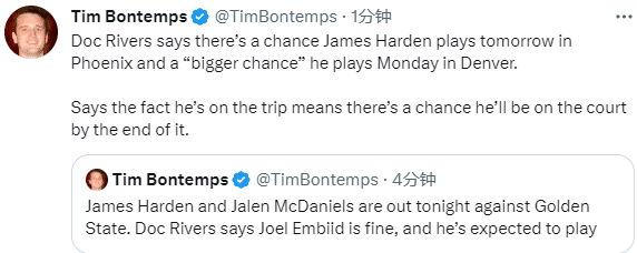 由于跟腱的伤势,哈登连续缺席2场比赛,今日缺战勇士无缘大战库里,大胡子何时能够复出?据费城主帅里弗斯表示,哈登可能明天复出对阵菲尼克斯太阳,下周二战掘金出战的可能性更大。