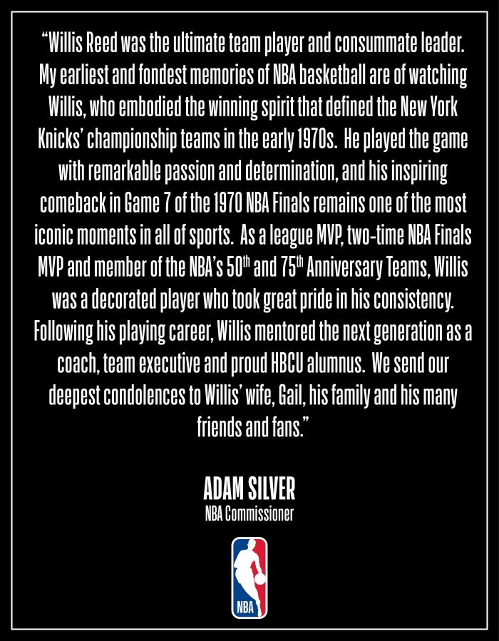 联盟总裁亚当-萧华发表声明,盛赞里德并且代表联盟表达沉痛的哀悼;尼克斯官方追悼里德:我们的队长。