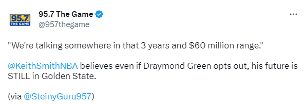 名记Keith Smith在节目中表示,追梦格林在夏天一定会拒绝执行下赛季2760万球员选项,并与勇士或者其他球队签下一份更合理的合同:我认为追梦新合同可能会在3年6000万左右。因为这样做的话,他可以增加更多的保障金额,这有助于球队减少奢侈税的支付。”