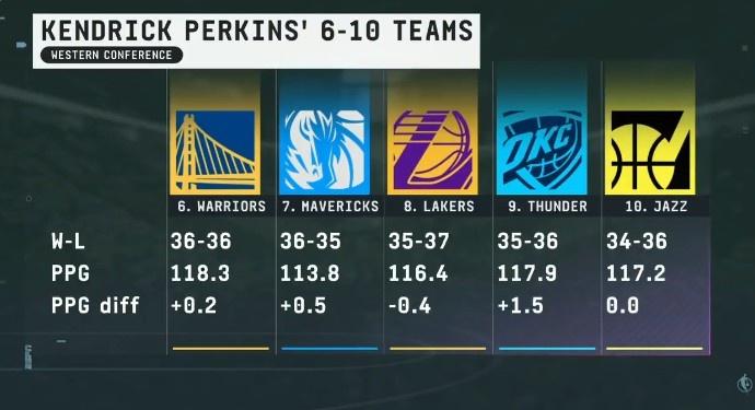 目前勇士36胜36负排在西部第7位,名嘴帕金斯预测了本赛季西部最终6-10名的排序;具体排名如下:
