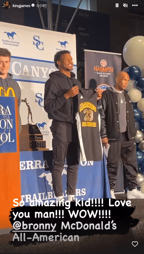 湖人迎来短暂的调整期,湖人没有比赛,詹姆斯到场祝贺布朗尼收获麦当劳精英赛荣誉球衣,布朗尼身穿23号球衣,詹姆斯曾在骑士和湖人时期穿过23号,这相当于是一种传承。