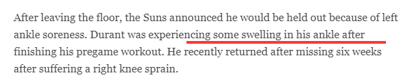 在太阳对阵雷霆赛前,杜兰特准备了出战,却在热身时不幸滑倒受伤,从现场画面可以看出,杜兰特的左脚踝呈90度扭伤,如此意外受伤太离谱;之后太阳官方宣布杜兰特因左脚踝酸痛退出比赛,克雷格顶替杜兰特进入首发阵容。