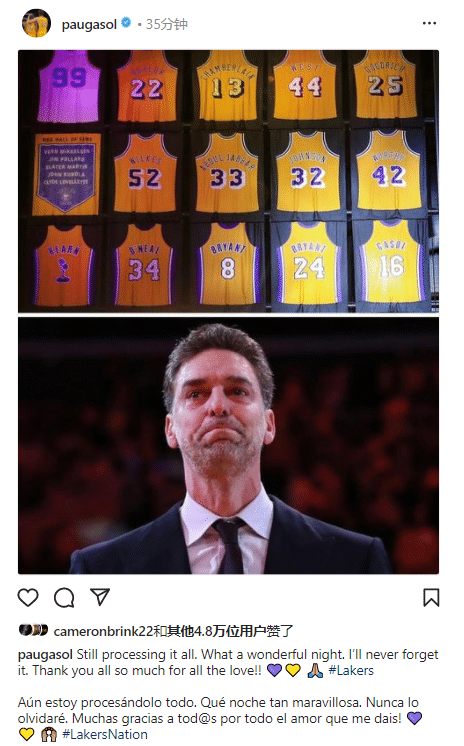 不久前,加索尔晒照并且发文感谢湖人,写道:仍旧在回味这一切,多么美妙的夜晚,我永远不会忘记,谢谢你们所有人的厚爱!!