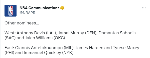 西部:浓眉(湖人)、穆雷(掘金)、萨博尼斯(国王)、杰伦-威廉姆斯(雷霆)