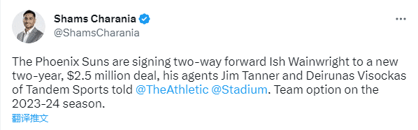 24直播网讯02月25日,据名记Shams Charania报道,经纪人透露,太阳与前锋伊什-韦恩莱特签下一份2年250万美元的合同。其中合同第二年(2023-24赛季)为球队选项,恭喜太阳肌肉哥正式转正,助四巨头冲击总冠军。