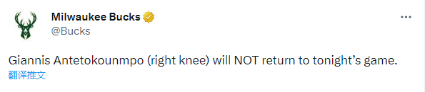 雄鹿官宣字母哥伤退:无接触右膝受伤请求下场 仅打6分钟提前退赛