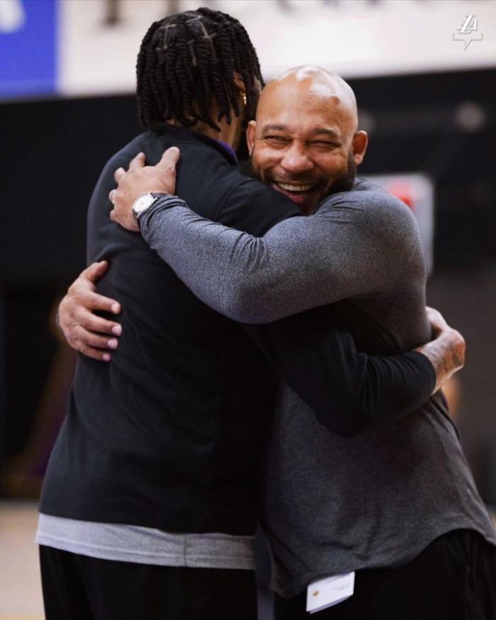 经过一段时间的休息,湖人众将回归球馆,队内训练,班巴和加布里埃尔跳球,期间班巴上演双手暴扣;拉塞尔赤膊训练,训练中秀中投;施罗德突破包夹强硬上篮;训练之余,哈姆紧紧抱着浓眉,哈帅满脸笑容太开心。