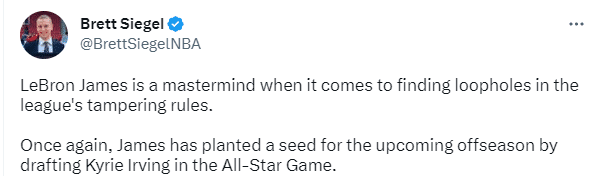 NBA记者Brett Siegel发推写道:詹姆斯是一位在联盟招募规则中寻找漏洞的大师,他再一次为今年休赛期湖人追求欧文埋下了种子,他在全明星中挑选了欧文;Siegel还表示这是一个灰色地带,詹姆斯可能会在更衣室或全明星赛期间招募欧文,只要没有录音、邮件等记录,联盟就无法证明这件事。