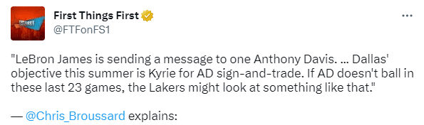 名嘴Chris Broussard在节目中表示,勒布朗-詹姆斯向安东尼-戴维斯发出了一个信号,独行侠今夏的目标是先签后换交易欧文引援浓眉;若浓眉在最后23场表现糟糕,湖人可能会这样做。