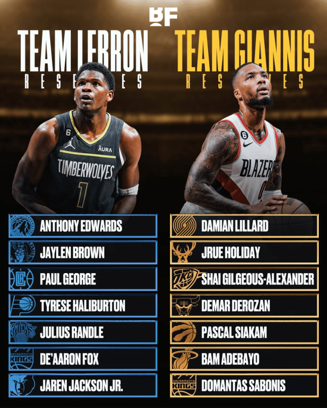 字母哥第四轮选择德罗赞,詹姆斯选择哈利伯顿;字母哥第五轮选择西亚卡姆,詹姆斯选择兰德尔;字母哥第六轮选择阿德巴约,詹姆斯选择福克斯。替补的最后一轮,字母哥选择萨博尼斯,把小贾伦-杰克逊留给詹姆斯。