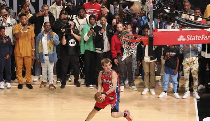 到了万众瞩目的扣篮大赛,麦克朗表现极其出色,他在预赛和决赛4次扣篮,3扣满分。第一扣超越飞跃,一个人骑在另一个背上,他直接飞跃,拉杆、打板之后扣篮,惊呆所有人。决赛的两扣也都是50分满分,唯一的丢分来自预赛第二轮,麦克朗向下的一个折叠,空中转满了360,一次成功,莱斯利给49分。