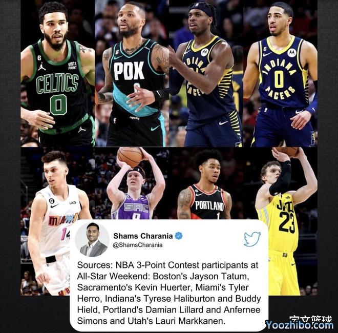 名记Shams透露2023全明星周末三分球大赛的参赛名单,8名参赛选手分别是塔图姆、利拉德、希尔德、哈利伯顿、希罗、赫尔特、安芬尼-西蒙斯和马尔卡宁。至于上届三分球大赛冠军唐斯,则是由于小腿拉伤处于伤停阶段,无缘本届赛事。