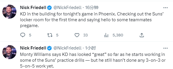 究竟杜兰特的伤势康复如何?太阳主帅蒙蒂-威廉姆斯透露,杜兰特已经开始恢复一些训练,而且在训练中表现得非常棒。但蒙蒂同时表示,杜兰特还没有开始进行任何3V3或者5V5的训练。
