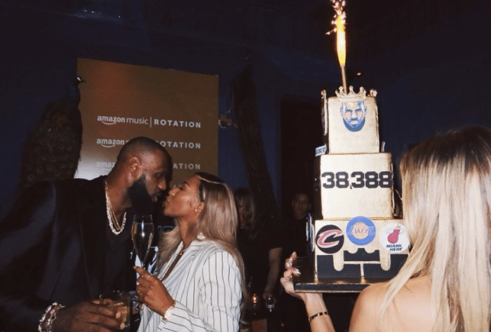 詹姆斯加冕历史得分王引爆全联盟,乔丹、诺维斯基以及现役球星杜兰特、库里等人都发声祝贺老詹;破纪录当晚,詹姆斯在洛杉矶举办庆祝派对,三层巨型蛋糕上印着很多破纪录的元素,在派对上,老詹又唱又跳并且深情亲吻萨瓦娜。