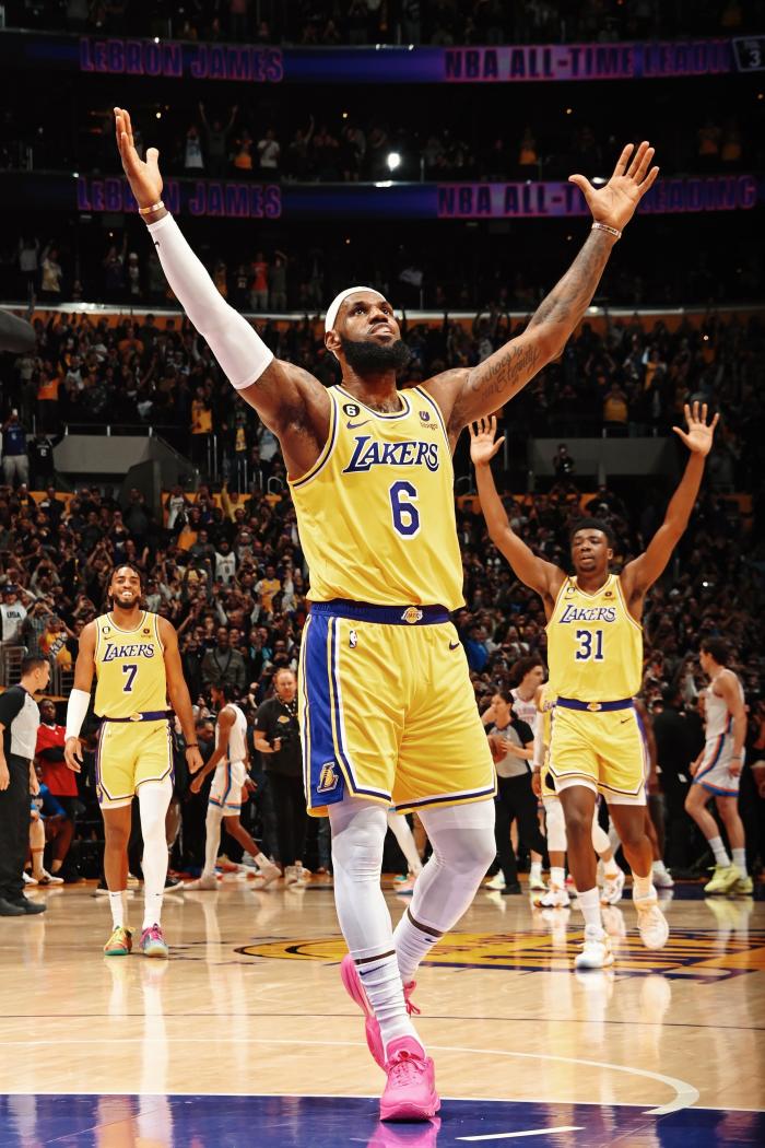 詹姆斯破纪录后湖人失误不断,老詹末节仅仅拿到2分,比赛还剩37.7秒湖人仅落后6分,詹姆斯提前放弃比赛,坐在替补席并且解开鞋带,最终湖人输掉比赛,赛后詹姆斯满脸笑容,接受采访时,詹姆斯表示:我知道我还能打好几年,即使在这个年龄,我也能帮任何一支球队赢得多个总冠军。