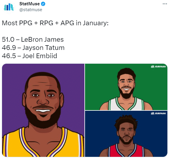 美媒StatMuse晒出了一组NBA一月份至今场均得分、场均篮板和场均助攻总和排名前三的球员数据,詹姆斯一月份场均轰下33.6分9.4篮板8助攻,三项之和为51位居联盟榜首;塔图姆场均31.4分10.1篮板5.4助攻,三项之和为46.9,恩比德则是场均34.0分9.8篮板2.7助攻,三项之和为46.5。