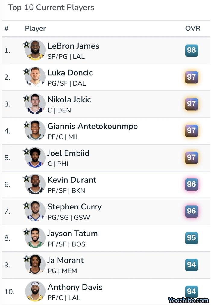 到目前为止,联盟2K能力值最高的十大球星分别是——詹姆斯最新能力值98联盟第一;东契奇、约基奇、字母哥和恩比德97并列第二,杜兰特和库里96并列第六位,塔图姆95排在第八,莫兰特和浓眉94并列第九。