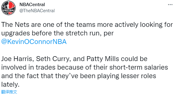 据报道,乔-哈里斯(年薪1860万美元)、赛斯-库里(年薪850万美元)和米尔斯(年薪650万美元)可能会被交易,除此之外,篮网的可用资产还有夏普、托马斯这样的年轻球员以及28、29年的首轮和27、28年首轮(来自76人);篮网三大射手可能被交易,因为他们的合同期限更短,篮网交易补强的目的是夺冠。
