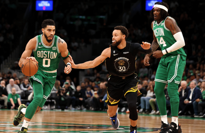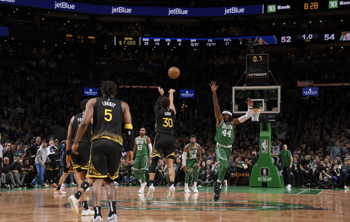 加时赛,两队打得十分精彩,2分42秒库里迎着布朗轰进三分,之后霍福德和塔图姆连中三分拉开分差,库里造犯规两罚全中,克莱6犯毕业,库里三分投出三不沾,最终勇士加时输掉比赛。