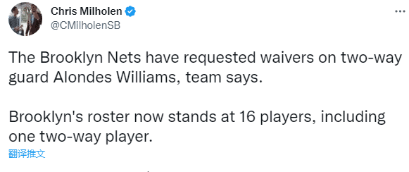 阿隆德斯-威廉姆斯今年23岁,身高1米96体重95公斤,本赛季仅仅为篮网打过一场比赛,上场5分钟0分1篮板;如今阿威已经篮网裁掉,篮网此举是为了腾出一个阵容名额,为后续引援以及交易做准备,目前篮网大名单上有16名球员。