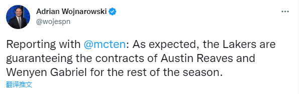 据ESPN名记沃纳罗斯基报道,正如所预期的那样,湖人将奥斯汀-里夫斯和韦尼恩-加布里埃尔本赛季的剩余合同转为保障合同。