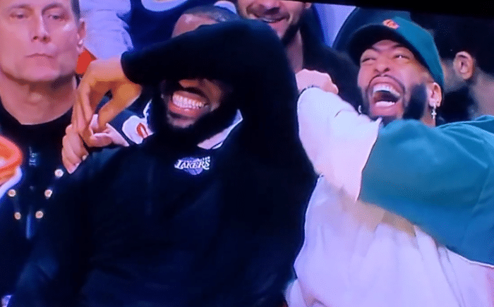 湖人双巨大笑一幕曝光:詹眉替补席笑翻天 38岁詹皇63秒两扣太狠