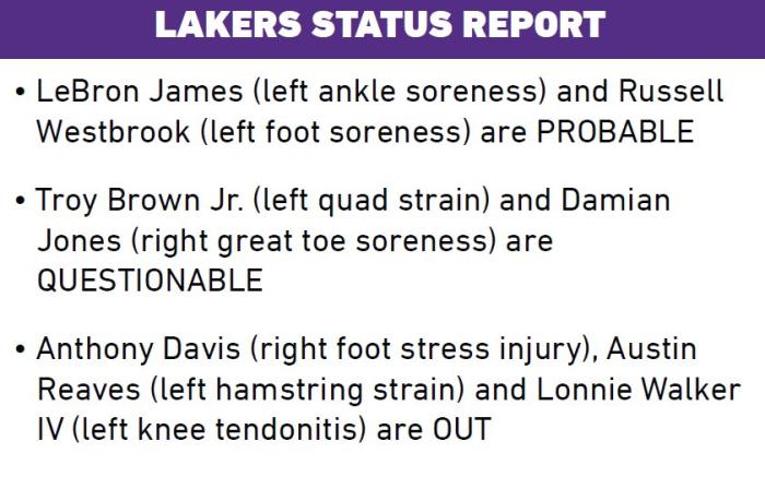 来源:24直播网01-06 10:2624直播网01月06日讯 ,湖人官方正式公布下一场对阵老鹰的伤病报告,詹姆斯(左脚踝酸痛)和威少(左脚酸痛)大概率出战;特洛伊-布朗(左四头肌拉伤)和达米恩-琼斯(右脚趾酸痛)出战成疑;浓眉(右脚伤病)和里夫斯(左腿筋拉伤)和沃克(左膝肌腱炎)缺席;上一场90度崴脚的施罗德伤势无碍,不在伤病名单上。