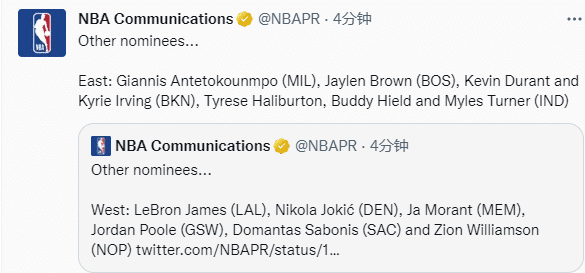 东部:雄鹿字母哥、凯尔特人杰伦-布朗、篮网杜兰特和欧文,步行者队哈利伯顿、希尔德和特纳