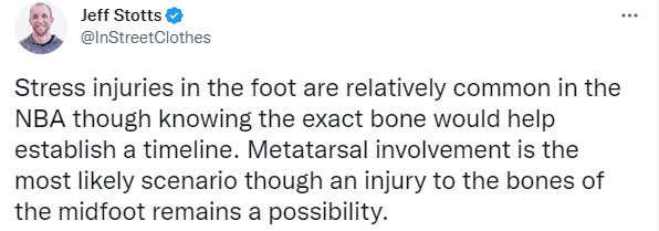 5、医学专家Jeff Stotts表示这种伤病在NBA比较常见,浓眉可能是跖骨或者中足骨骼损伤