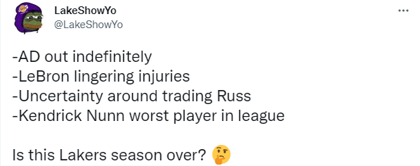 纳恩糟糕的表现被吐槽,湖人媒体Lakes Daily发推写道,国王队今晚的MVP是肯德里克-纳恩;NBA Retweet表示纳恩醒来后会觉得很危险;lakeshowyo表示浓眉无限期休战,詹姆斯挥之不去的伤病,威少交易的不确定性,纳恩是联盟最差的球员,湖人的赛季结束了吗?