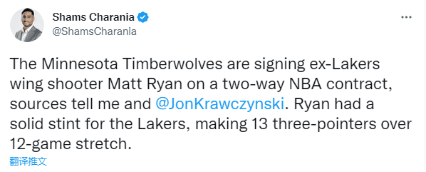 来源:24直播网12-07 15:5124直播网12月07日,NBA励志哥再就业,据名记shams报道,森林狼和湖人旧将马特-莱恩签下一份双向合同,莱恩在湖人队表现出色,12场比赛投进13记三分,更是投进绝平三分拯救球队。