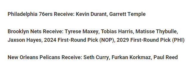 美媒认为,通过这样的交易,76人可以立即成为夺冠级别的球队,杜兰特、哈登和恩比德组成超级三巨头,篮网则可以获得重建的筹码,鹈鹕则获得一些老将,能够为锡安和英格拉姆提供更多的帮助。