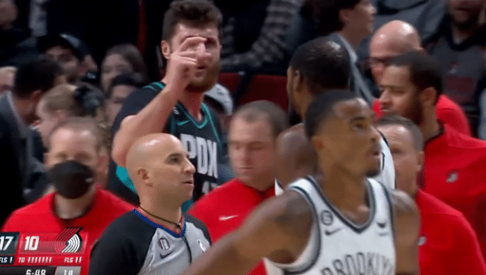 今日一战,篮网神射乔-哈里斯手感火热,开场接连轰下10分,助篮网17-10占上风;暂停时,杜兰特和开拓者中锋努尔基奇互喷垃圾话,互喷之后努尔基奇冲着KD比出“你太小”的嘲讽手势,值得一提的是,两人互喷前,努尔基奇持球背打杜兰特,这碰撞太激烈。
