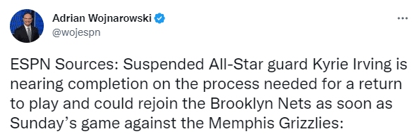 沃纳罗斯基报道,欧文将缺席周五篮网与开拓者的比赛,这是欧文被禁赛的第8场比赛,他即将结束禁赛,有望在下周一篮网主场对阵灰熊的比赛中复出。