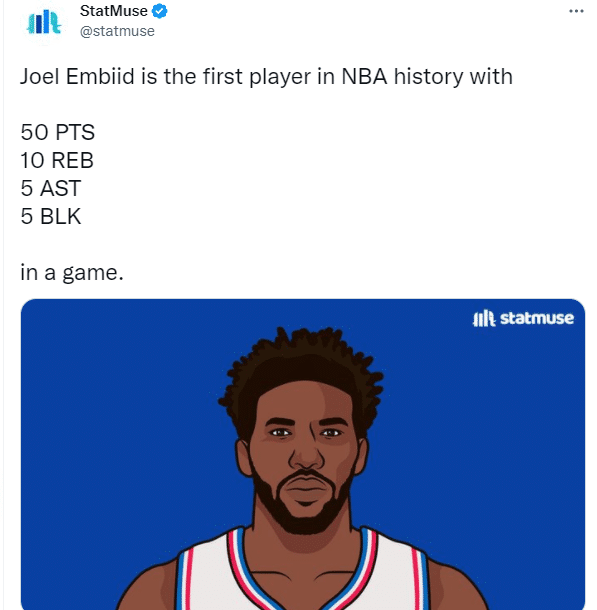9、恩比德成为NBA史上第一位单场得分50+、篮板10+盖帽5+和助攻5+的球员,