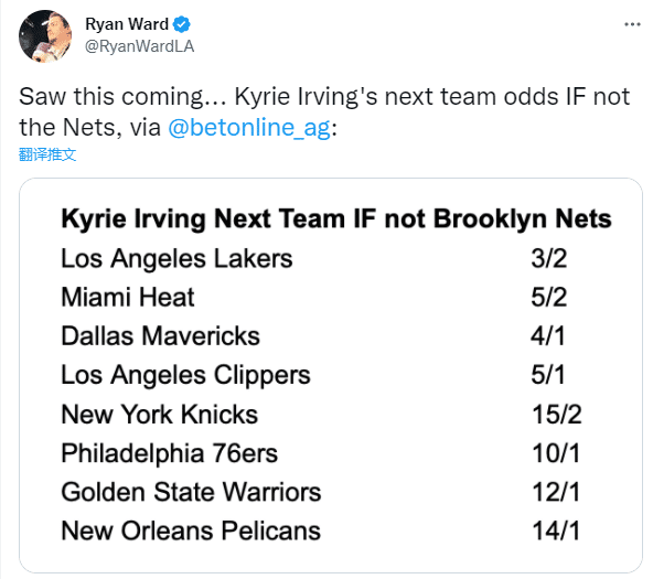 湖人随队记者Ryan Ward今日在推特晒出博彩公司为欧文开出的离队下家赔率,湖人领先高居第一。