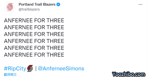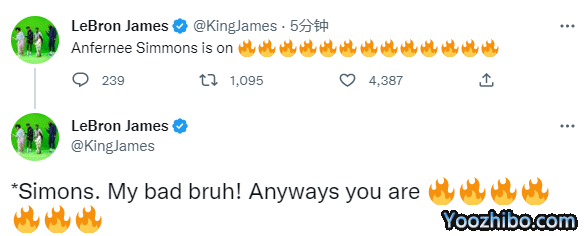 看到西蒙斯的表现,詹姆斯羡慕并且盛赞开拓者新星,发推写道:安芬尼-西蒙斯状态火爆;之后更正写道:是Simons,抱歉,我的错,无论如何,他的火爆了。