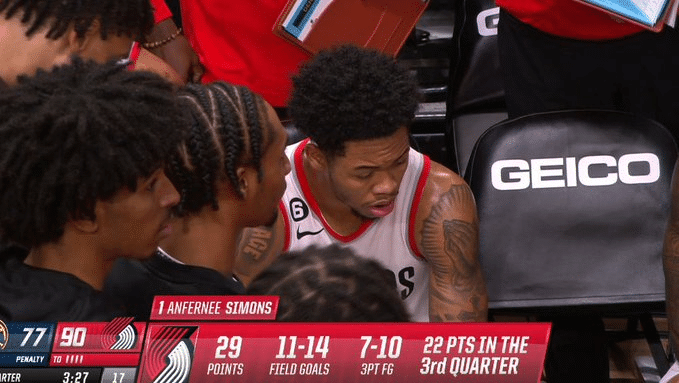 开拓者第一节23-31落后掘金8分,第二节32-30追回2分,整个上半场,23岁的西蒙斯仅仅贡献7分,不过下半场,西蒙斯第三节迎来大爆发,前8分钟8中8独砍22分,期间3分钟内连续命中6记三分,无论面对谁,他都稳稳命中;安芬尼手感火热点燃替补席,众队友疯狂庆祝,整个球馆都被点燃了。
