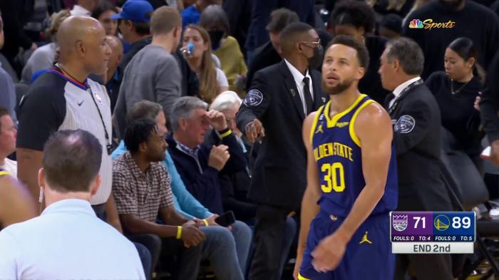 第二节,普尔带着替补阵容与国王拉锯,7分57秒库里上场,上来便中投得分,之后库里外线三分火力全开,远投三分提前扭头庆祝,火速抢断并且轰进三分,一防一攻点燃球馆,勇士替补席嗨翻天;再加上维金斯等人输送火力,勇士单节50-35净胜15分,半场领先18分。